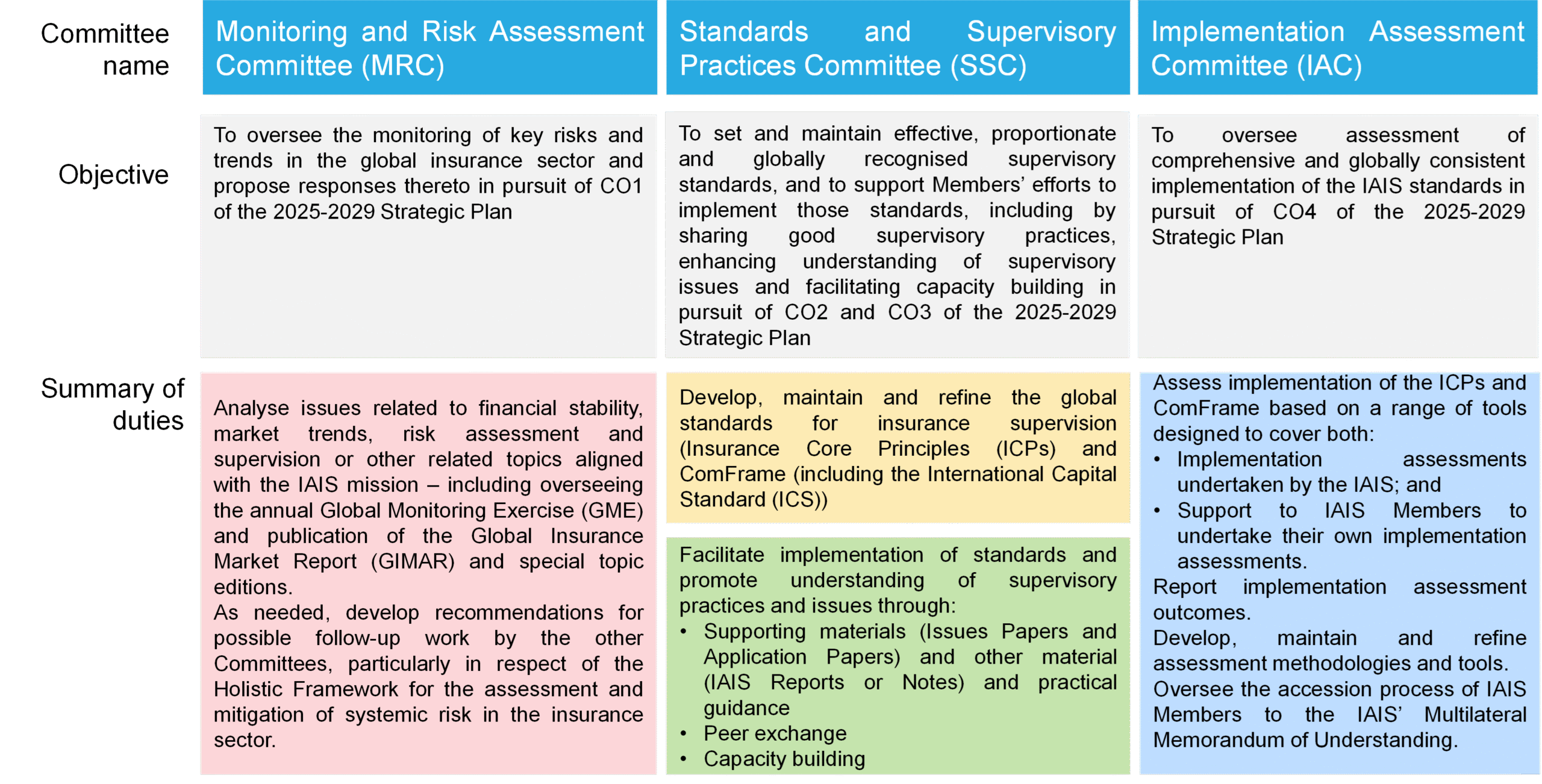 The IAIS conducts its activities through a system of committees, subcommittees and other groups. The IAIS activities are led by the Executive Committee, which is supported by five committees – Audit and Risk, Budget and, from 1 January 2026, the new committees replacing the existing MPC, PDC and IAC.