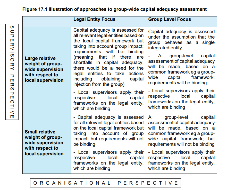 It should be noted that the supervisory approach to entities/activities within the insurance group may vary depending on factors such as their types of business, legal status and/or nature, scale and complexity of risks. Although an insurance group as a whole should be subject to group-wide supervision, not all quantitative and qualitative supervisory requirements applied to an insurance legal entity should necessarily be applied to other entities within the group, to the insurance group as a whole, or to a sub-group collectively.